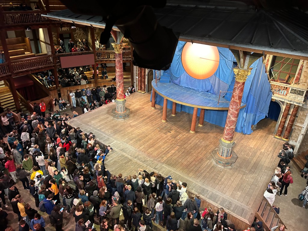 While up to 3000 people watched plays at the Globe in Shakespeare’s day, the replica is only licensed for around 1600 people given modern-day safety regulations. There were originally just two exits, now there are seven. Today, there is the option to stand in the exposed groundling area in front of the stage (tickets here are £5 or £10, as opposed to one penny in the 16th century). As in Shakespeare’s day, it costs more to have a seat in one of the covered galleries (I paid £72 to watch a recent production). But these benches still aren’t the most comfortable, even with cushions (£3 rental). The stage is covered by a roof, ornately painted underneath with depictions of the Heavens, and held up by two large pillars.